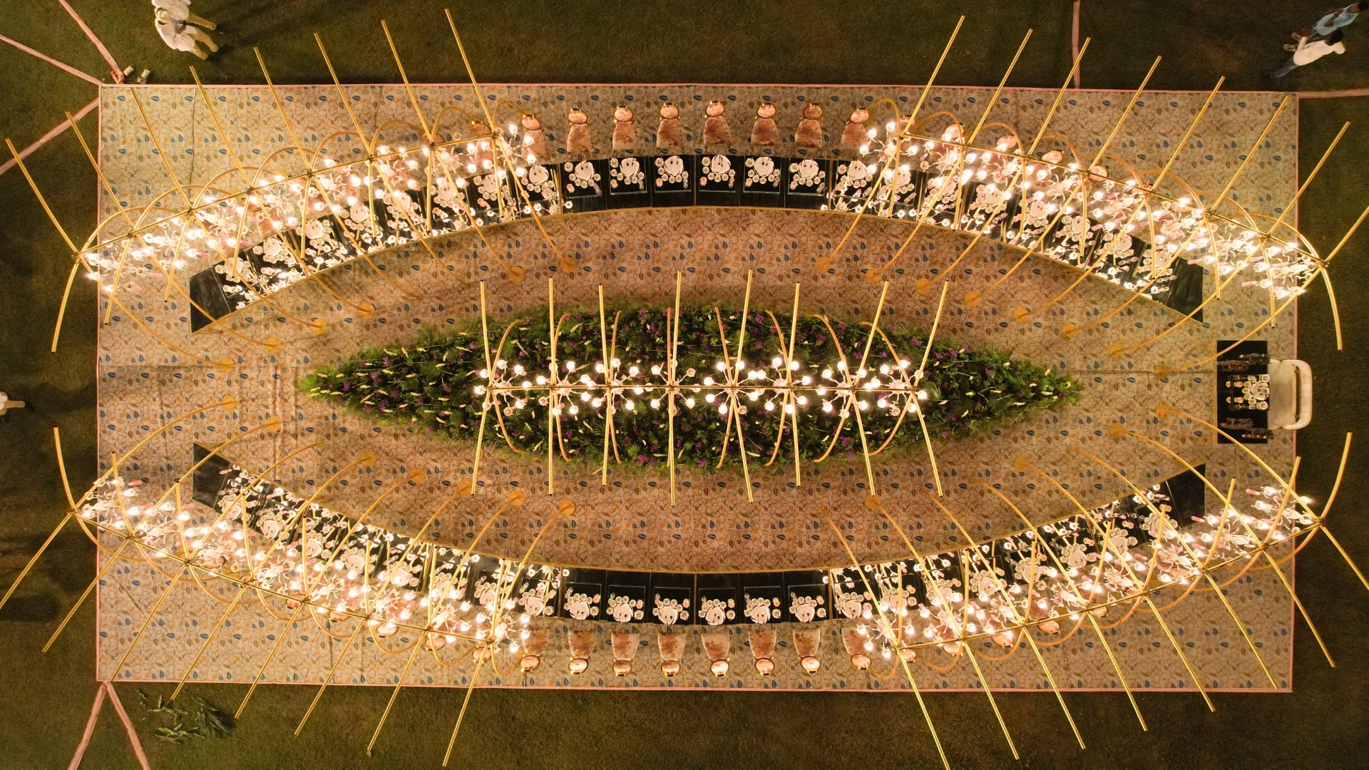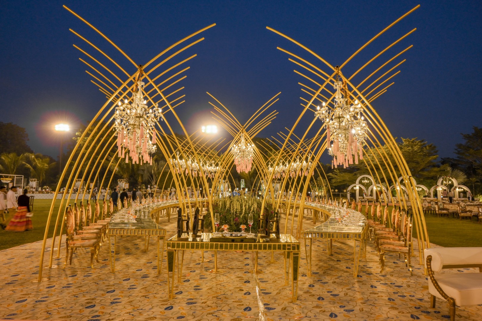 As guests indulge in a delectable feast, the dining experience is elevated by the captivating beauty of their surroundings created by the avenue of crystal chandeliers, soft lights and fresh flora. To enhance the ambiance and add an extra touch of luxury, personalized table arrangements are strategically placed throughout the venue, creating a serene & immersive experience.