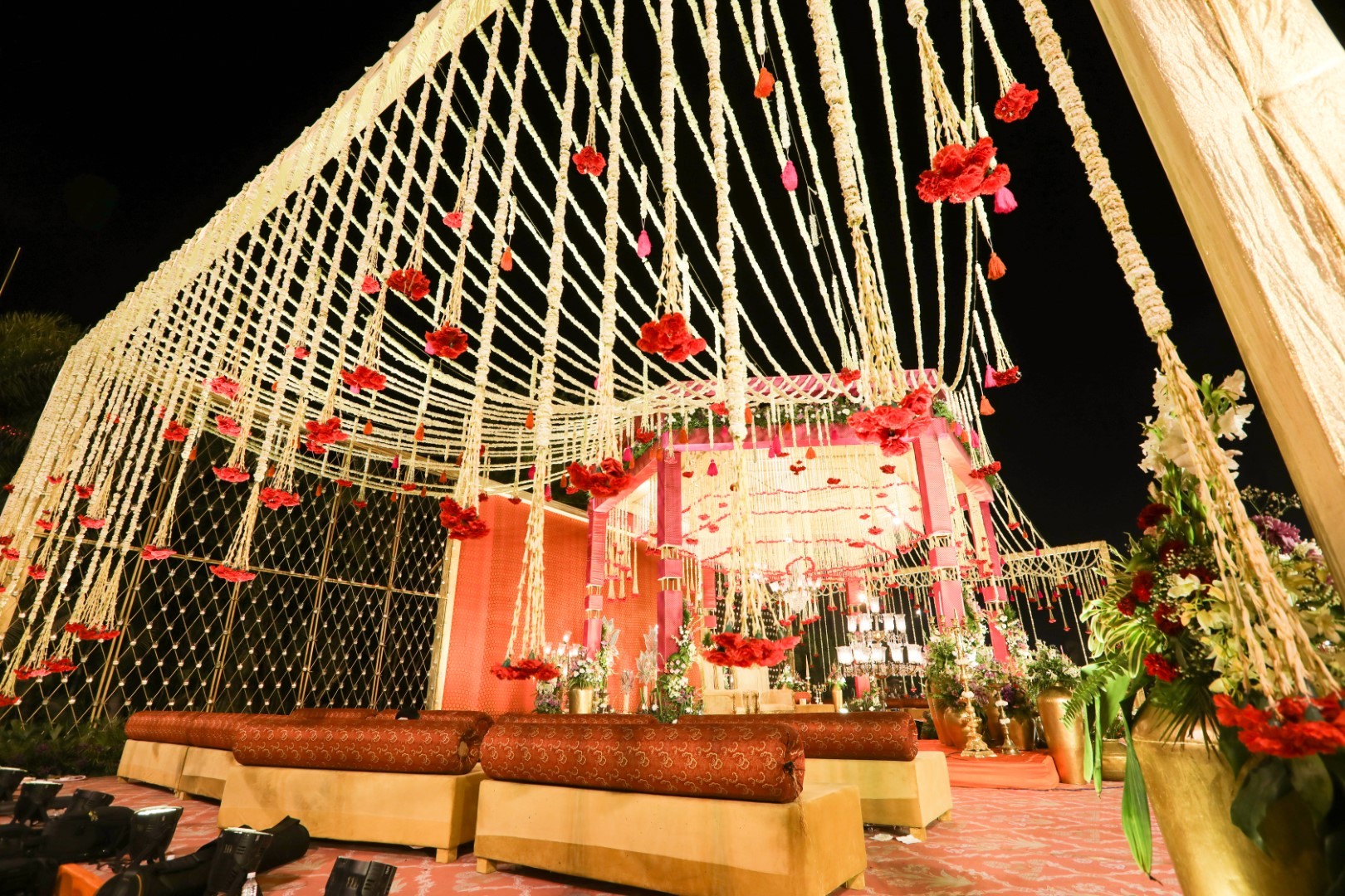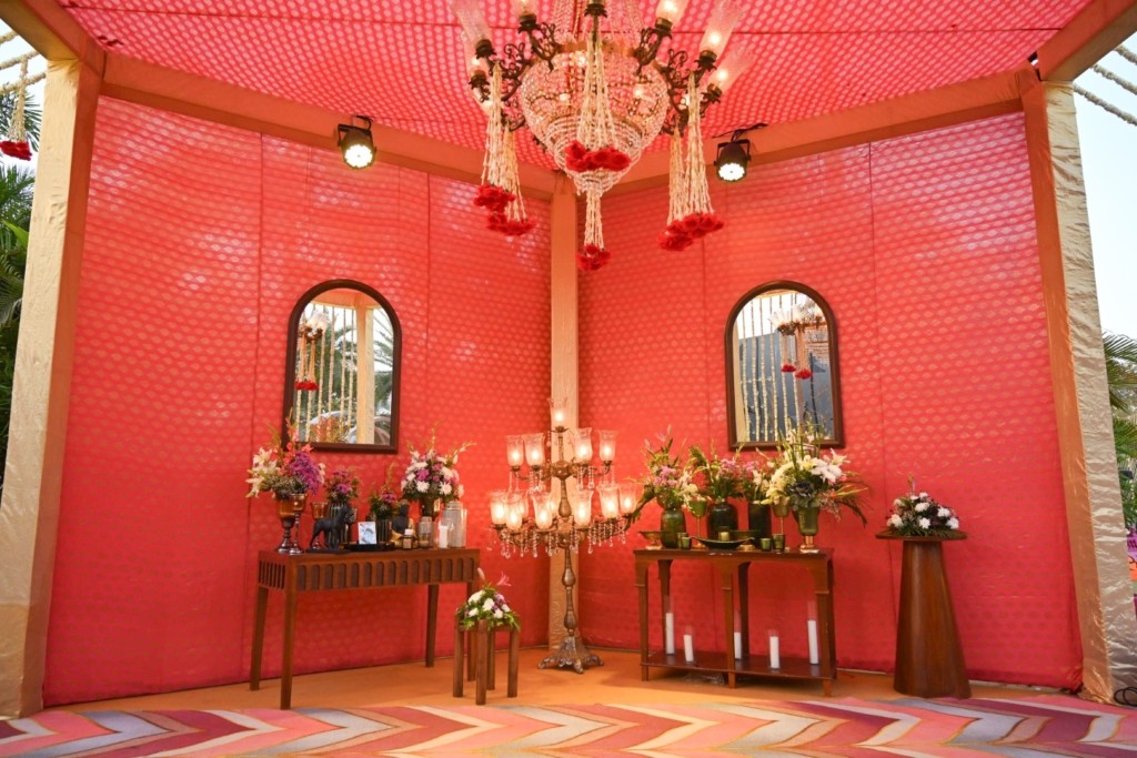 Fresh flowers are the central element of Rutavan, symbolizing love, beauty, and prosperity. Fragrant tuberose, vibrant roses and white sawanti are meticulously arranged in stunning centerpieces and cascading floral installations. These floral masterpieces will infuse the space with their enchanting scents and vibrant colors, creating a visual feast for the senses. The chori or the main stage is an adobe of heaven with guest in comfort of plush furniture witnessing the exchange of wows in presence of all elements like Earth, Water, Air And Fire incorporated seamlessly on and around the podium. The lotus sculpted with fresh flowers symbolizing the presence of Maa Laxmi blessing the ceremony right above the havan kund.